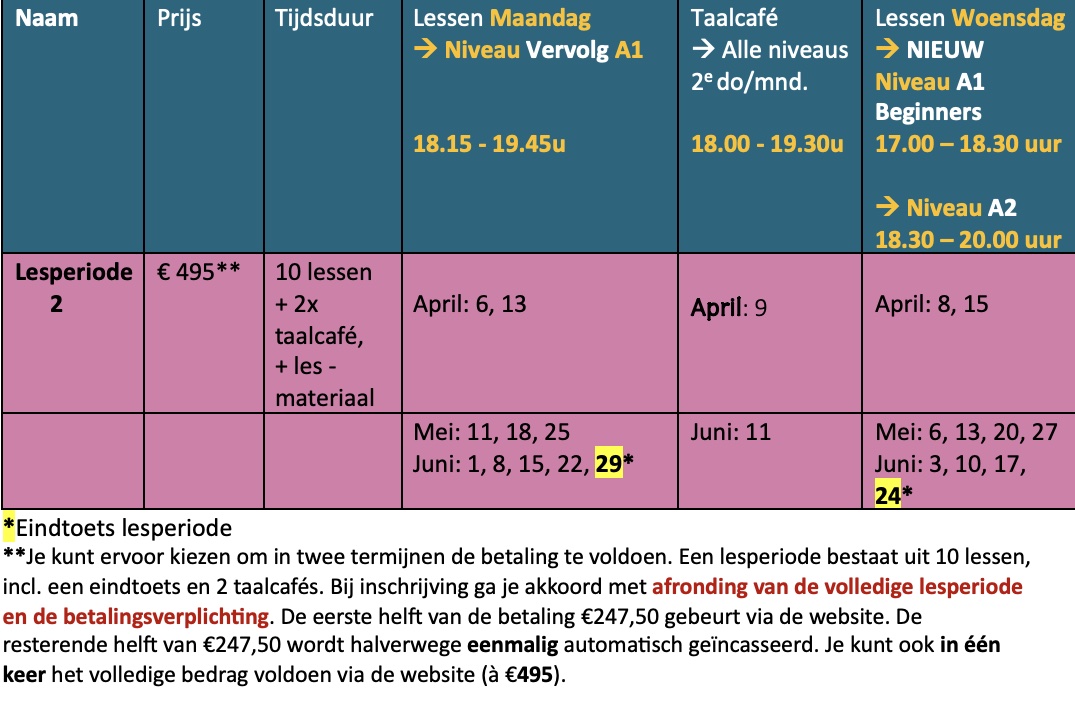 Beginners A2: woe 8 apr t/m woe 24 juni '26. 18.30 - 20.00 uur